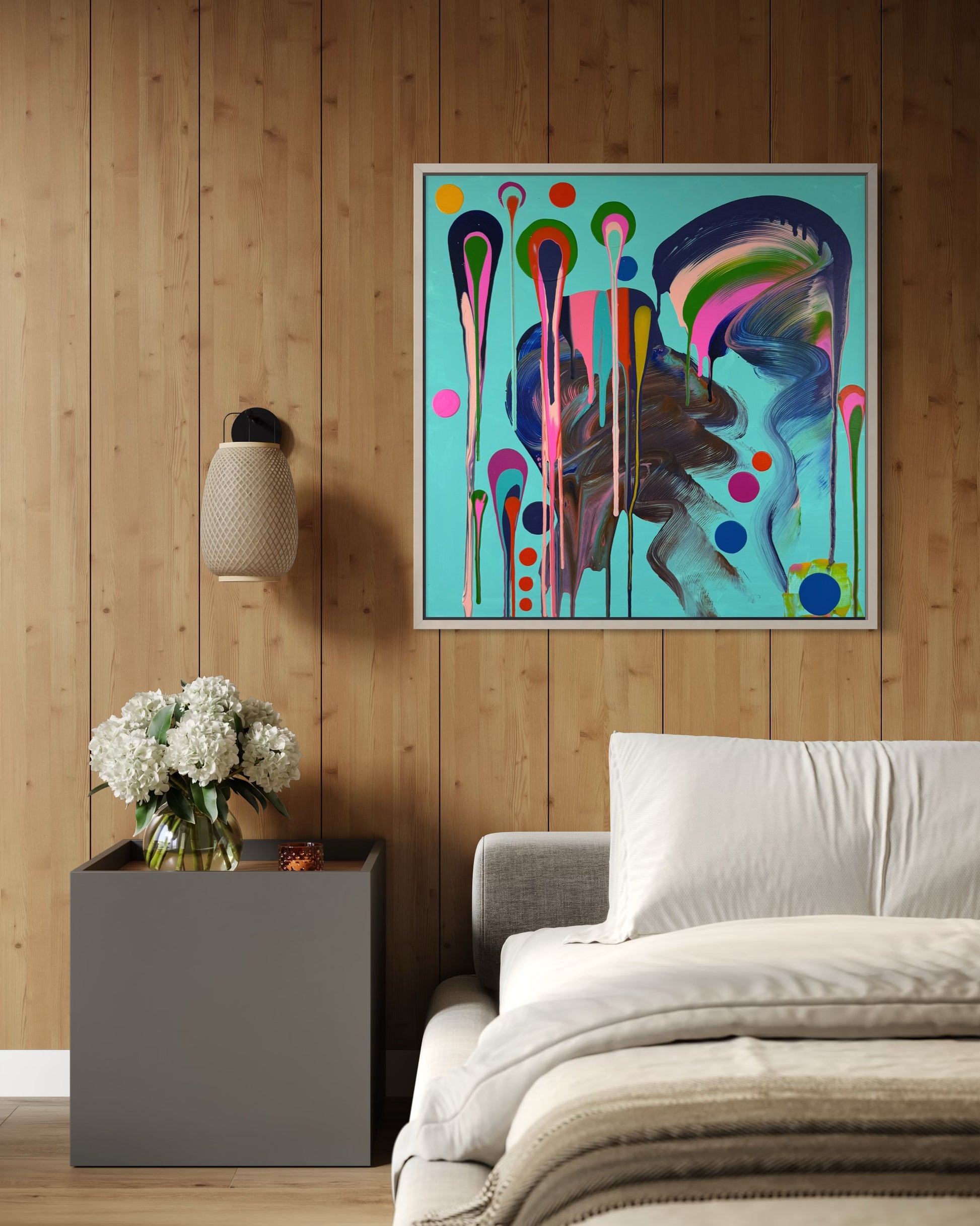 Mixed media on canvas framed in painted oak, 78cm x 78cm.