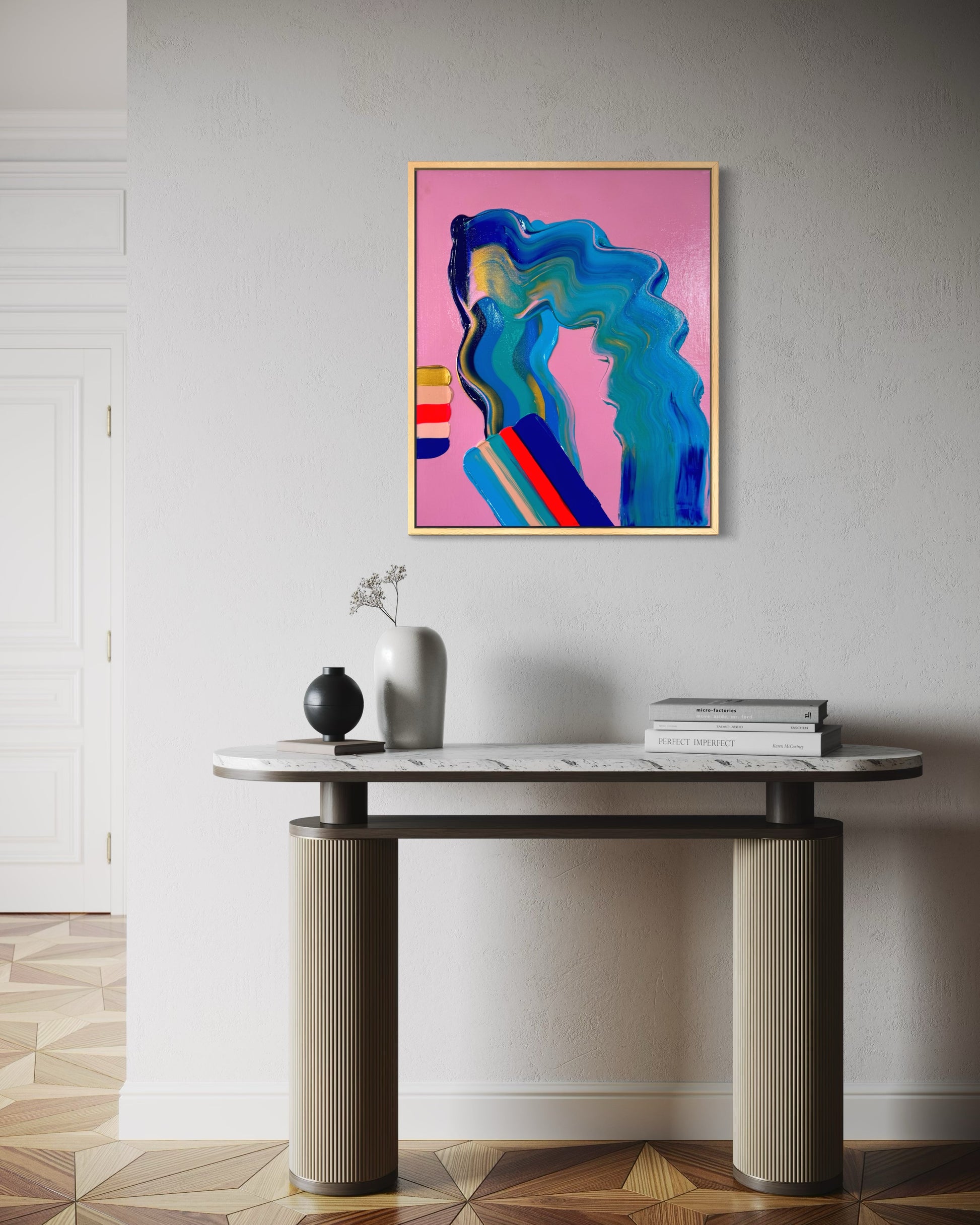 Acrylic on canvas, framed, 62cm x 52cm.